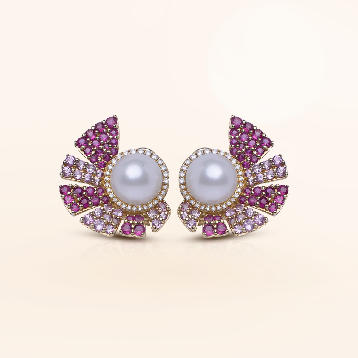 Aretes de Perlas con Zafiros Rosados y Diamantes en Oro Amarillo